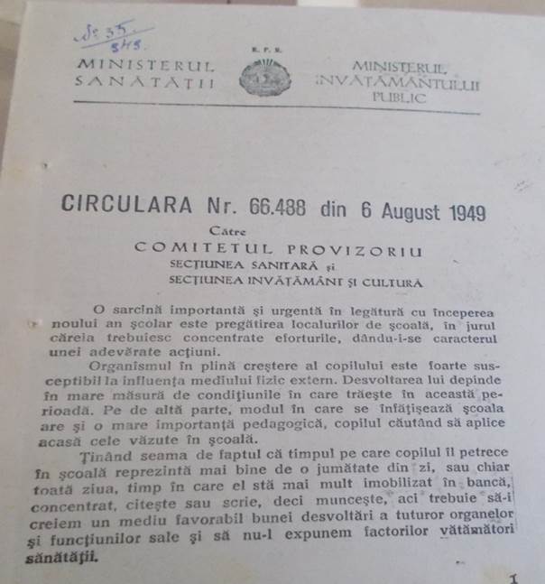 Tot în acest an, un alt ordin al Ministerului, face cunoscut faptul că în luna august se vor ține cursuri în vederea obținerii definitivării in invatamant precum si in vederea obtinerii gradului didactic II. In anul 1949, Ministerul da un ordin prin care toate unitățile de învățământ care erau in subordinea Ministerului Învățământului Public au fost arondate și date în grija Sfatului Popular. Circulara din 6 august 1949, trimisă de către Ministerul Sănătății și Ministerul Învățământului Public dă directive în legătură cu începerea noului an școlar în ceea ce privește pregătirea localurilor de școală, asigurarea optimă a condițiilor igienico-sanitare, să fie urmărite interesele copiilor în vederea creării unui mediu favorabil bunei dezvoltări a tuturor organelor și să nu fie expuși factorilor vătămători sănătății.