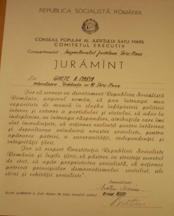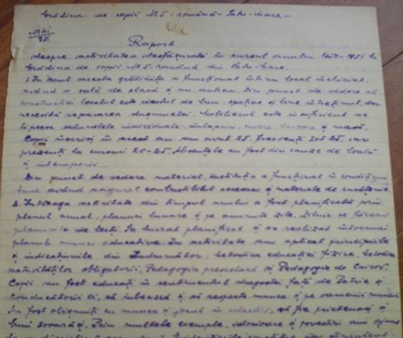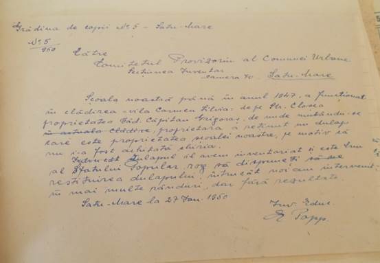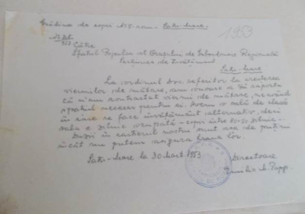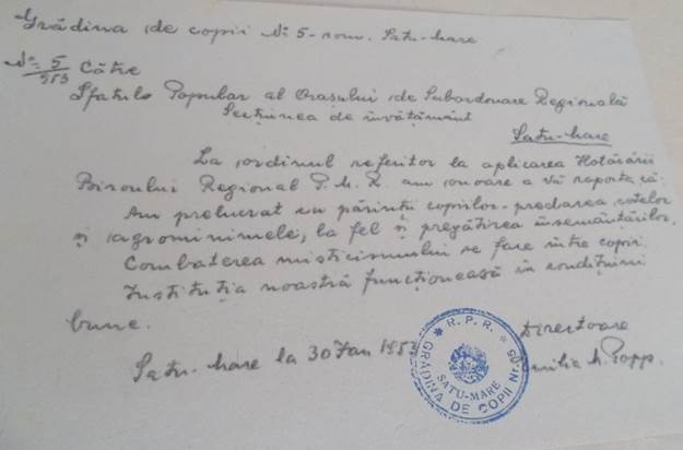 În anul 1950, datorită existenței unei producții scăzute de hârtie, Sfatul Popular de subordonare regională Satu Mare - Secțiunea de învățământ a trimis o circulară prin care cerea cadrelor didactice să îndrume elevii să păstreze cărțile și caietele în stare bună, precum și să participe la colectarea deșeurilor de hârtie (cartoane, reviste, ziare, pungi). Educatoarele aveau datoria de a întocmi rapoarte despre activitatea desfășurată în decursul unei luni (frecvența copiilor la activități, starea localului, combustibilul existent, situația sanitară a elevilor și a cadrelor, ședințele cu părinții, vizitele efectuate la domiciliul copiilor, activitatea școlară ținută și greutățile și neajunsurile întâmpinate). În cadrul vizitelor la domiciliu educatoarele urmăreau atât ” starea sanitară a copiilor” , cât și „condițiunile în care trăiesc”. Tot în aceste rapoarte se confirmă și participarea la ședintele de lucru ale colectivului de directori și la ședintele pedagogice. Totodată se menționa și frecventarea cercului de studiu: Istoria Partidului Comunist și al URSS. Educatoarele includeau în aceste rapoarte și modul de comemorare a diferitelor sărbători cum ar fi: Aniversarea zilei de naștere a Tov. Stalin (21 decembrie), Aniversarea Republicii (22 decembrie), Ziua Femeii (8 Martie) . Cu aceste ocazii se organizau serbări care se compuneau din poezii, cântece și dansuri.