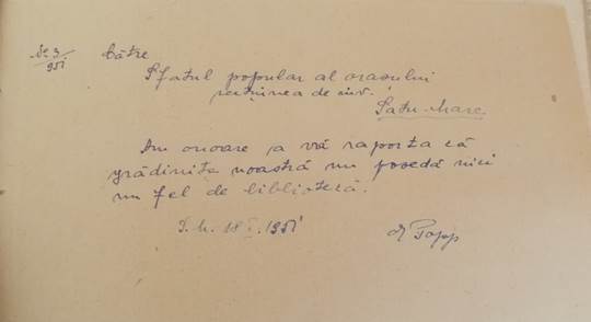 În anul 1951 grădinița nu poseda niciun fel de bibliotecă, ceea ce reiese din cererea înaintată Sfatului Popular de către directoarea Emilia Popp.