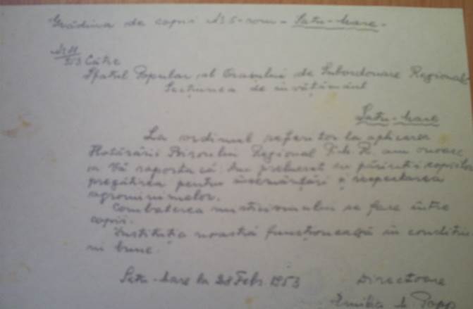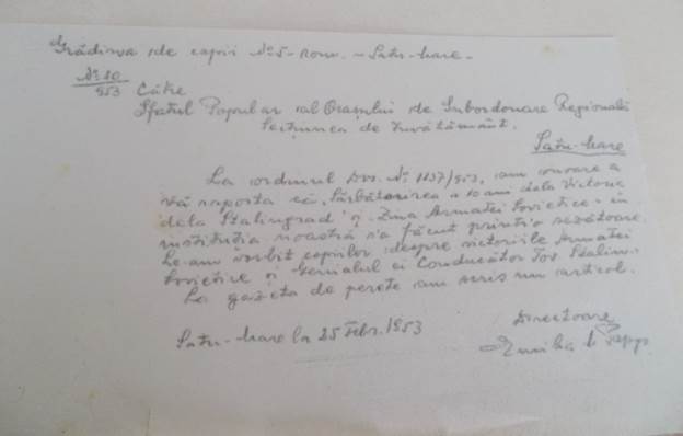 În anul 1953 educatoarea – directoare Emilia Popp raportează Sfatului Popular de subordonare regională Satu Mare - Secțiunea de învățământ că s-a ținut cea de-a 29 comemorare a morții lui Lenin, ce s-a realizat printr-o povestire despre personalitatea acestuia, poezii și cântece. În următorii ani directivele urmate în educarea preșcolarilor au fost aceleași ca și în anii precedenți.