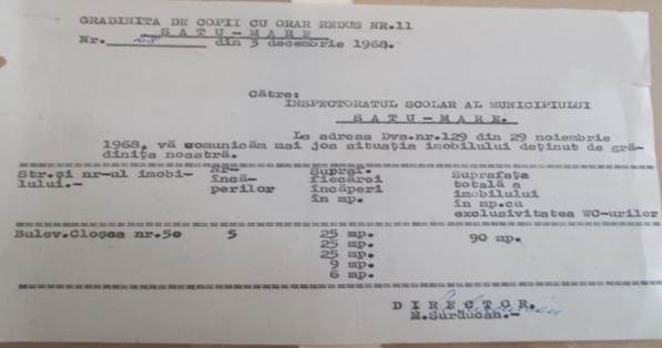 La solicitarea educatoarei - director Maria Surducan, Inspectoratul Școlar al Municipiului Satu Mare a comunicat situația imobilului deținut de grădiniță: numărul încăperilor: 5, suprafața totală utilizată: 90mp.