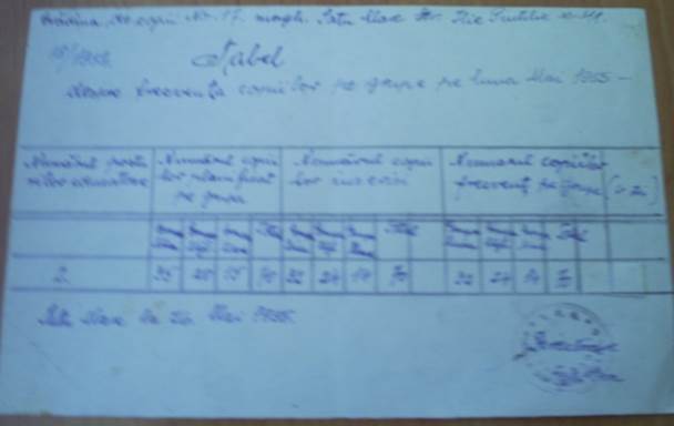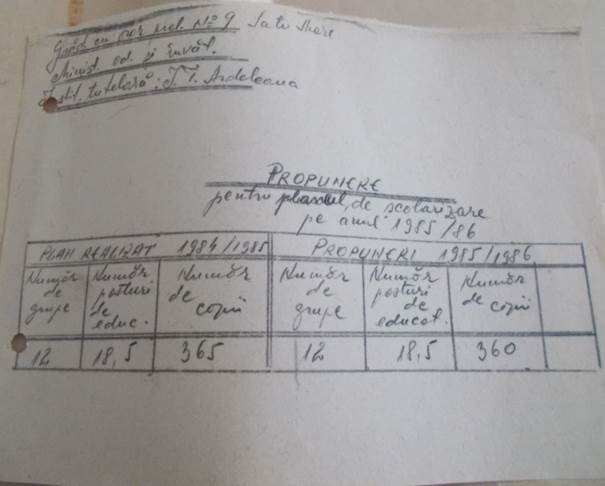 Se constată că la secția cu limba de predare română au fost înscriși 176 de copii și astfel a fost nevoie de înființarea a încă unui post de educatoare la limba română. La secția cu limba de predare maghiară, funcționa o grupă de copii combinată cu un număr de 47 de copii.
