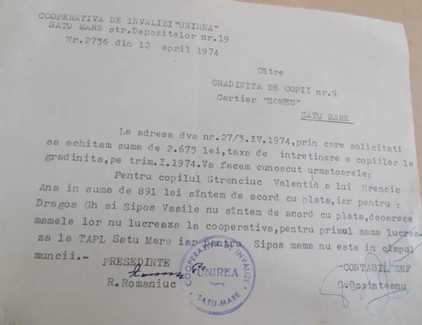 Învățământul preșcolar era arondat Sfatului Popular al orașului de subordonare regională Satu Mare – Secția de Învățământ. Lista necesarului în privința materialelor didactice (creioane, cretă , hârtie, jucării, cartoane, hârtii colorate, creioane colorate, mingi, etc.) , asigurarea lemnelor pentru încălzire, precum și plata chiriei au fost înaintate acestei instituții.